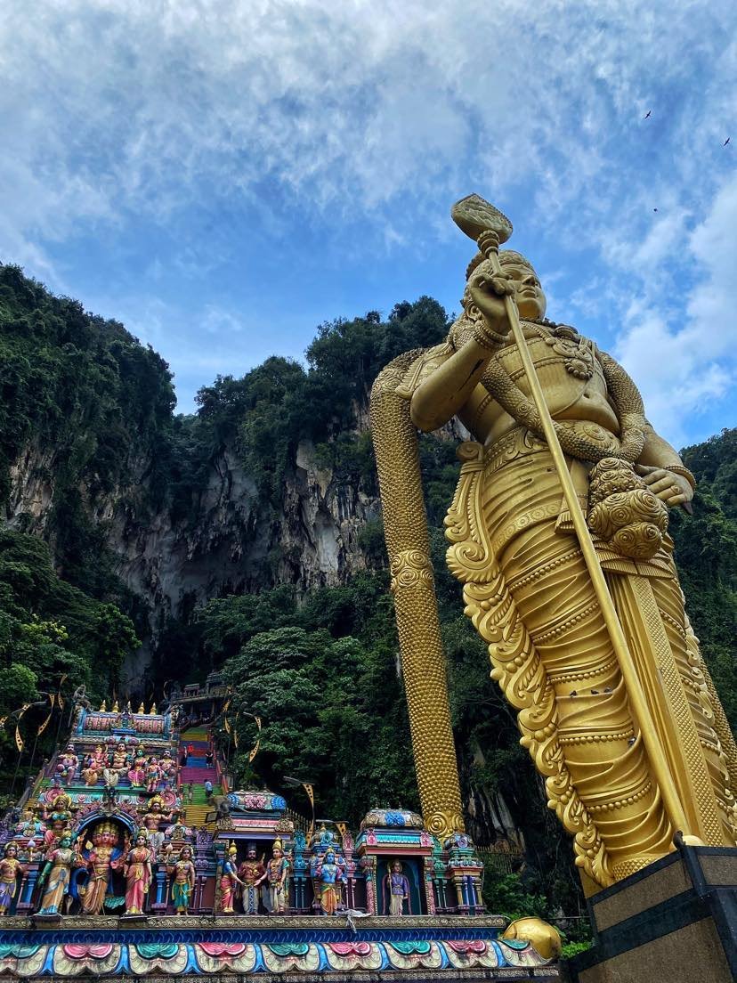 At the forefront of Batu Caves, a colossal statue of Lord Murugan commands attention, rising 42.7 meters into the sky. This monumental golden figure, with its intricate details and imposing presence, serves as the gateway to a realm where architecture and nature coalesce.