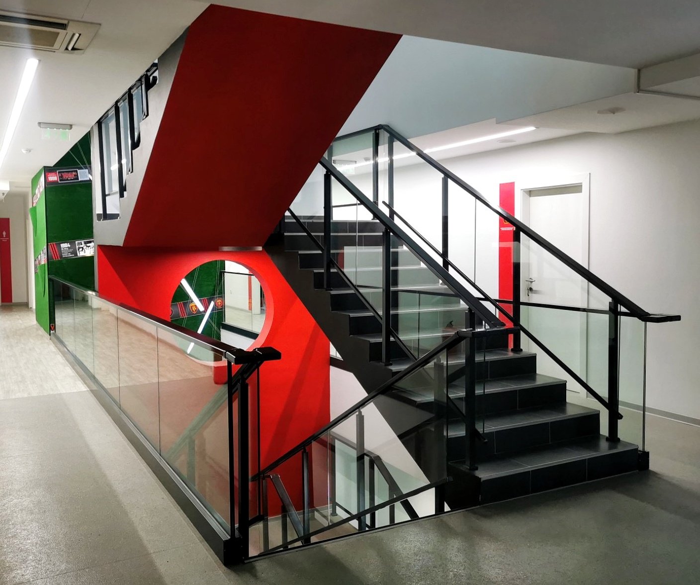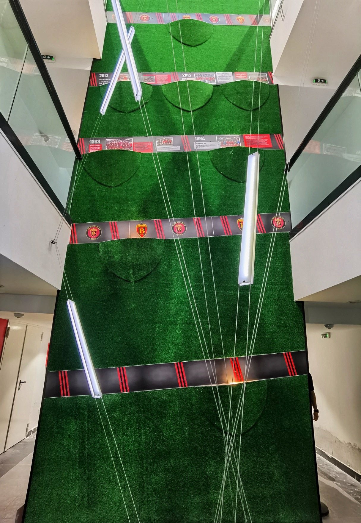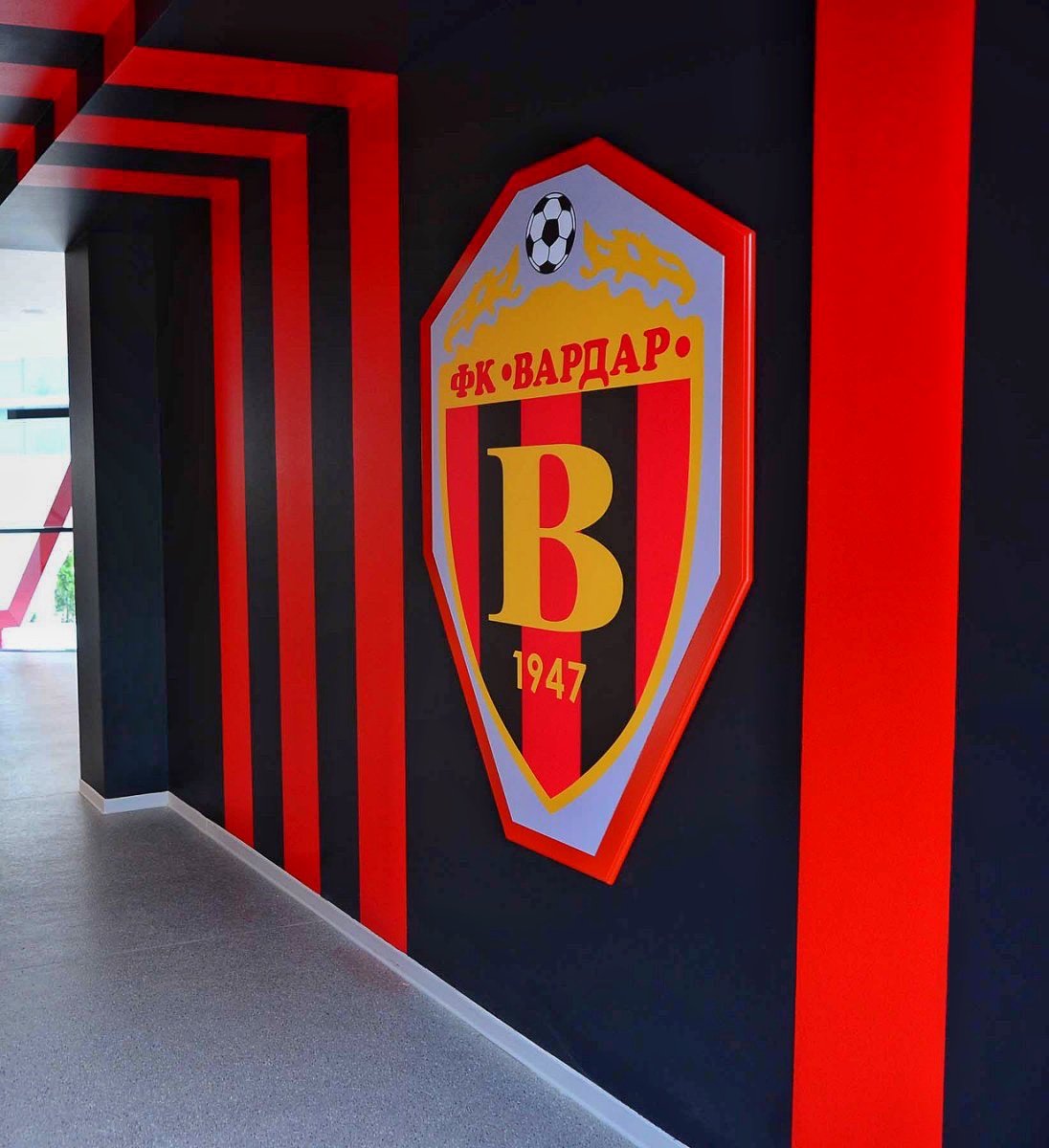 The exterior story of the football academy FC Vardar overflows in the interior organization of the space. The glass fence along the entire atrium is combined with a robust metal frame, open space in combination with greenery, but now it is set vertically along the height of the atrium. The atrium is complemented with characteristic objects with LED-lights. The building is full with contrasts which, linked in the right manner, depict the entire background and character of the club. And of course, the club colours are always present in each detail.