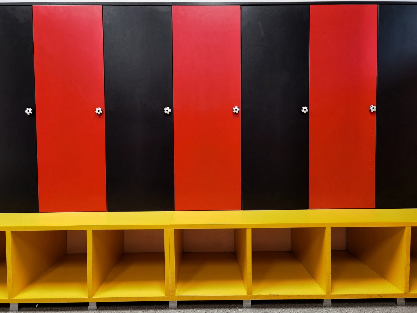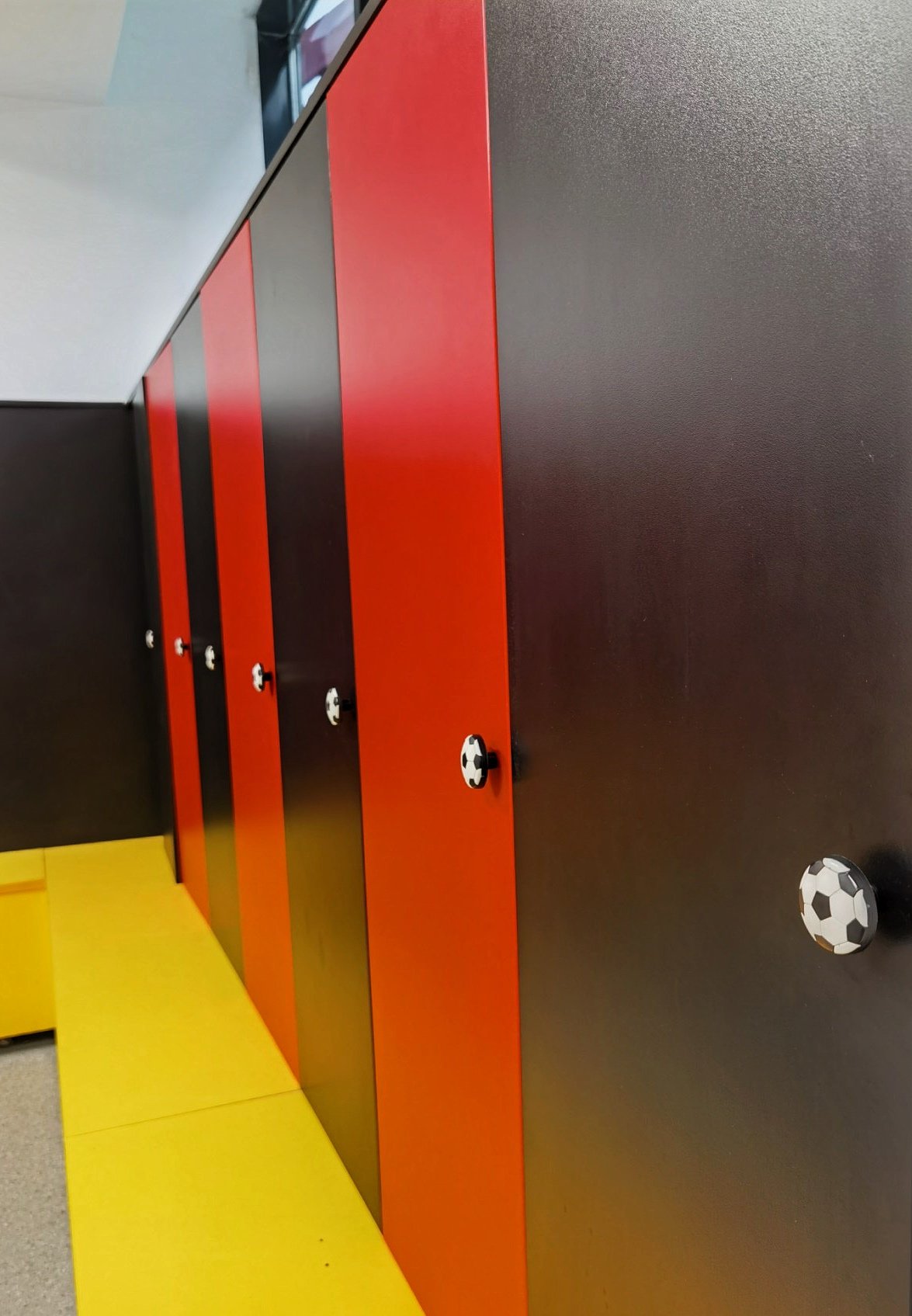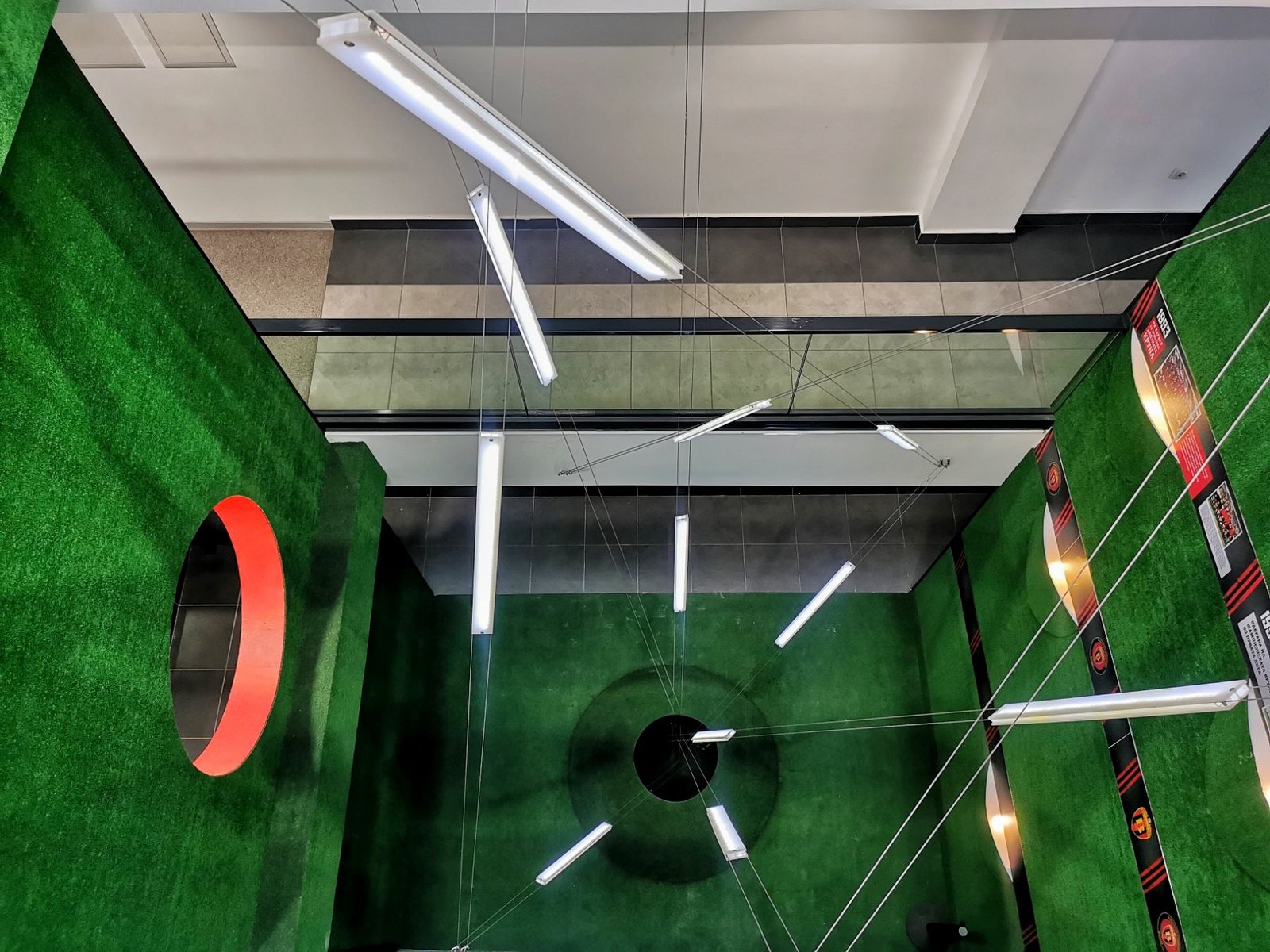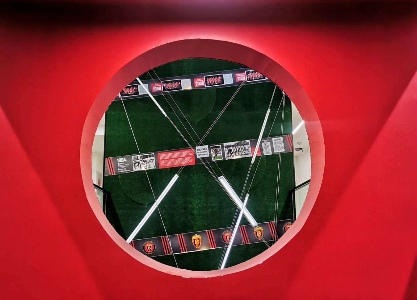 The exterior story of the football academy FC Vardar overflows in the interior organization of the space. The glass fence along the entire atrium is combined with a robust metal frame, open space in combination with greenery, but now it is set vertically along the height of the atrium. The atrium is complemented with characteristic objects with LED-lights. The building is full with contrasts which, linked in the right manner, depict the entire background and character of the club. And of course, the club colours are always present in each detail.