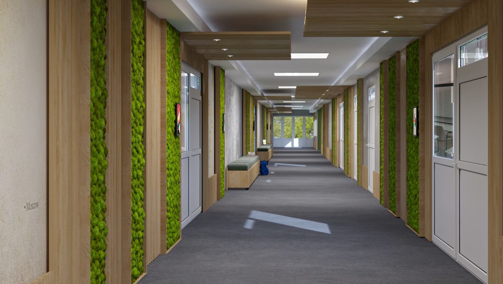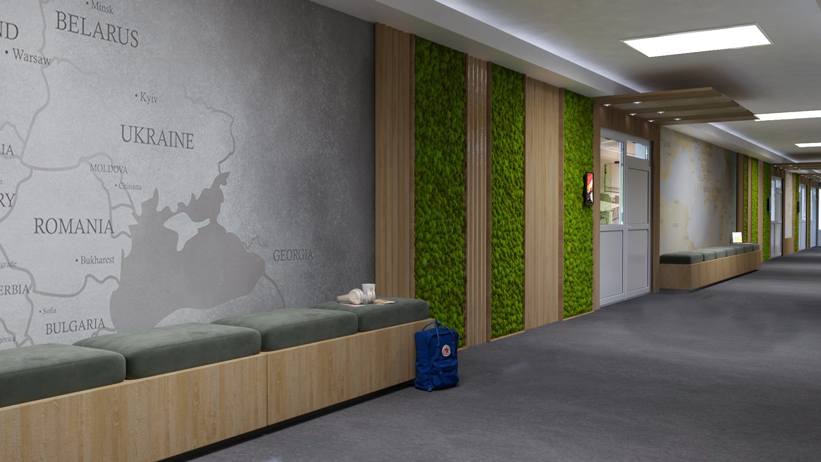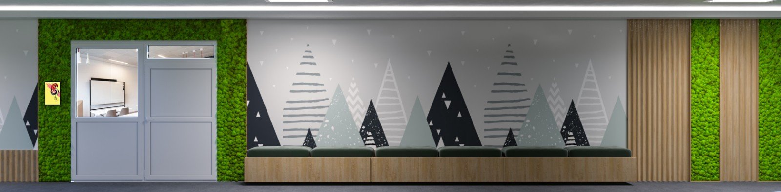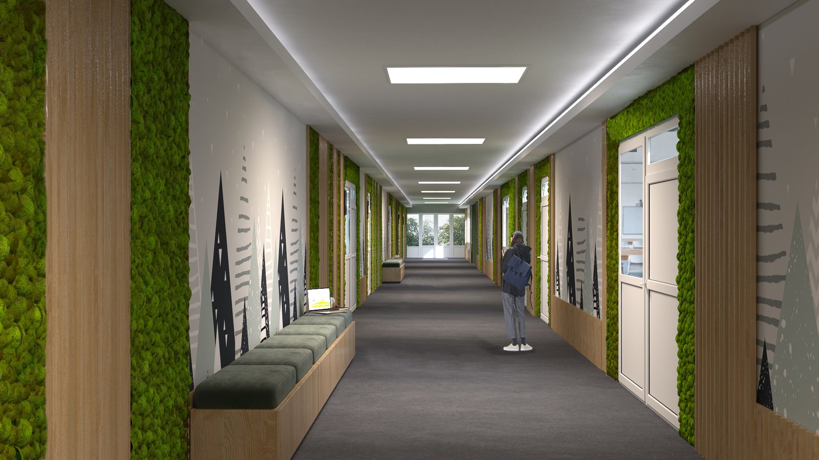 With the idea of bringing a part of nature into the school corridors, and having biophilic design in mind, we played with alternating surfaces of profiled mdf and natural greenery. In this way, we provided not only a slightly different experience for the students, but also protected the walls from possible damage.