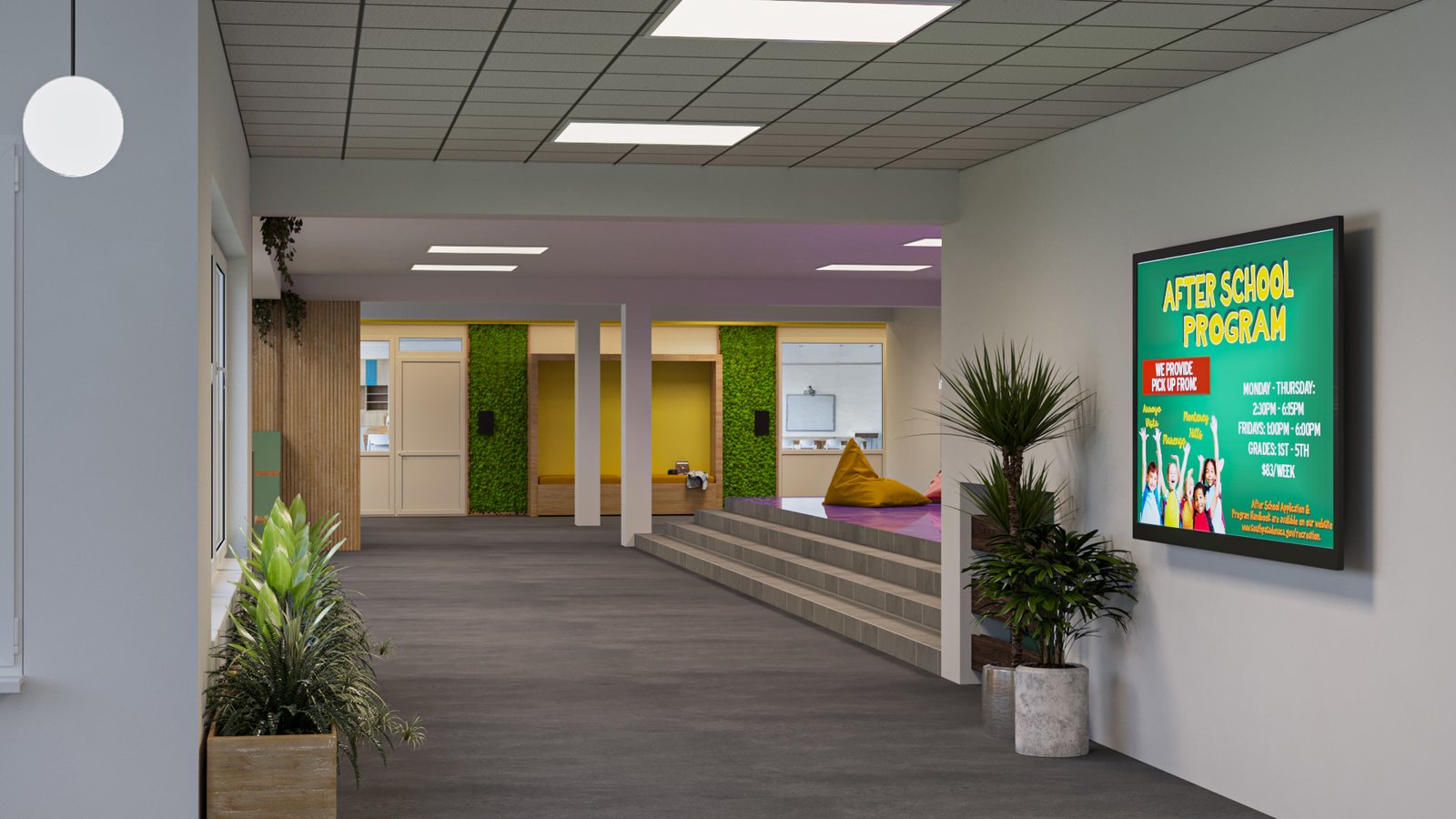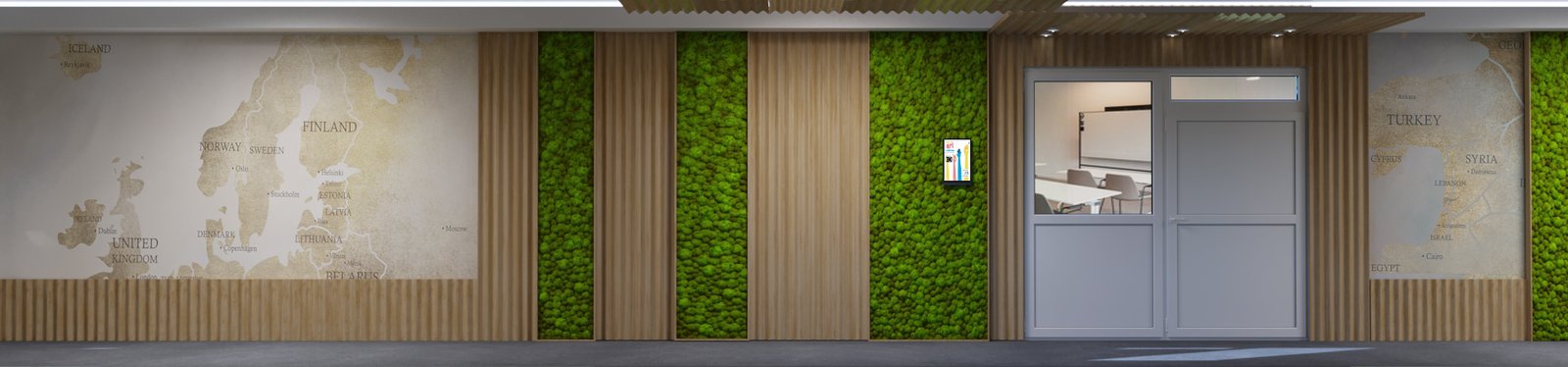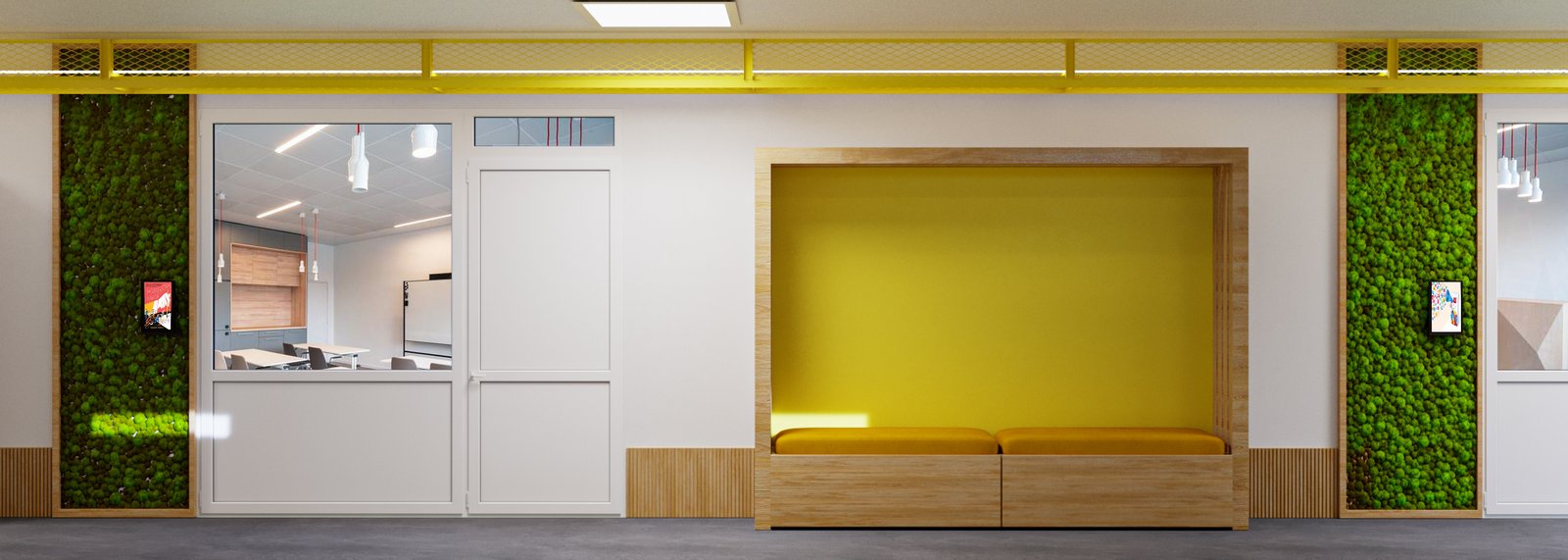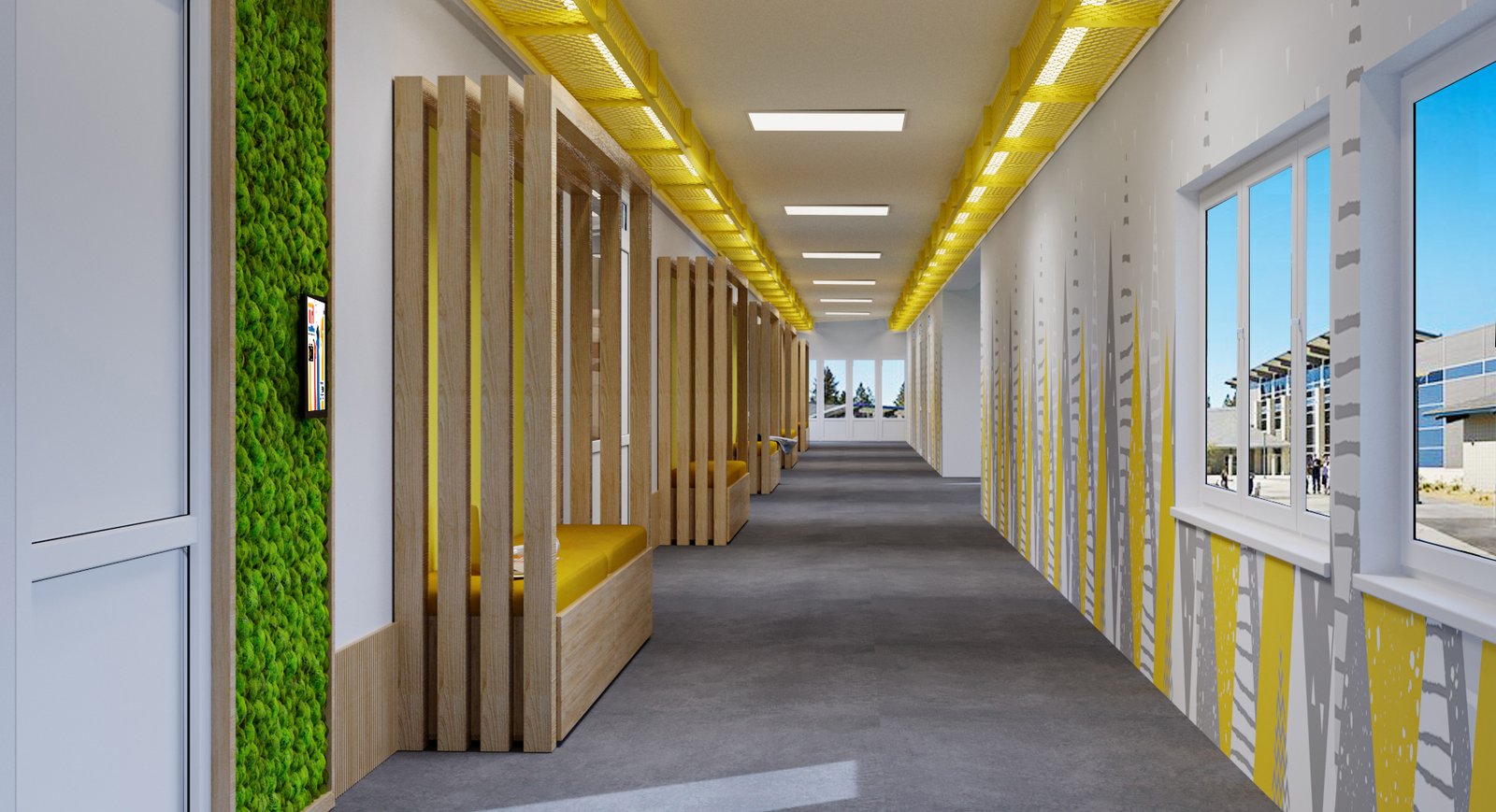 With the idea of bringing a part of nature into the school corridors, and having biophilic design in mind, we played with alternating surfaces of profiled mdf and natural greenery. In this way, we provided not only a slightly different experience for the students, but also protected the walls from possible damage.